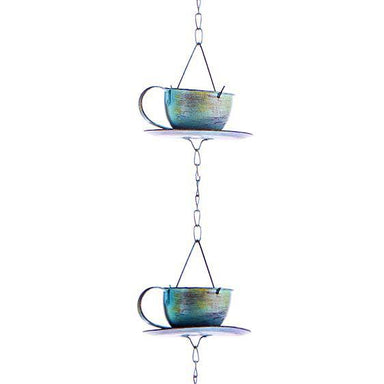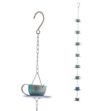 Add a touch of whimsy to your outdoor decor with our 'Green Patina Teacup Rain Chain.' This rain chain, measuring 3 3/4" W x 3 3/4" D x 59" H, feat...