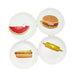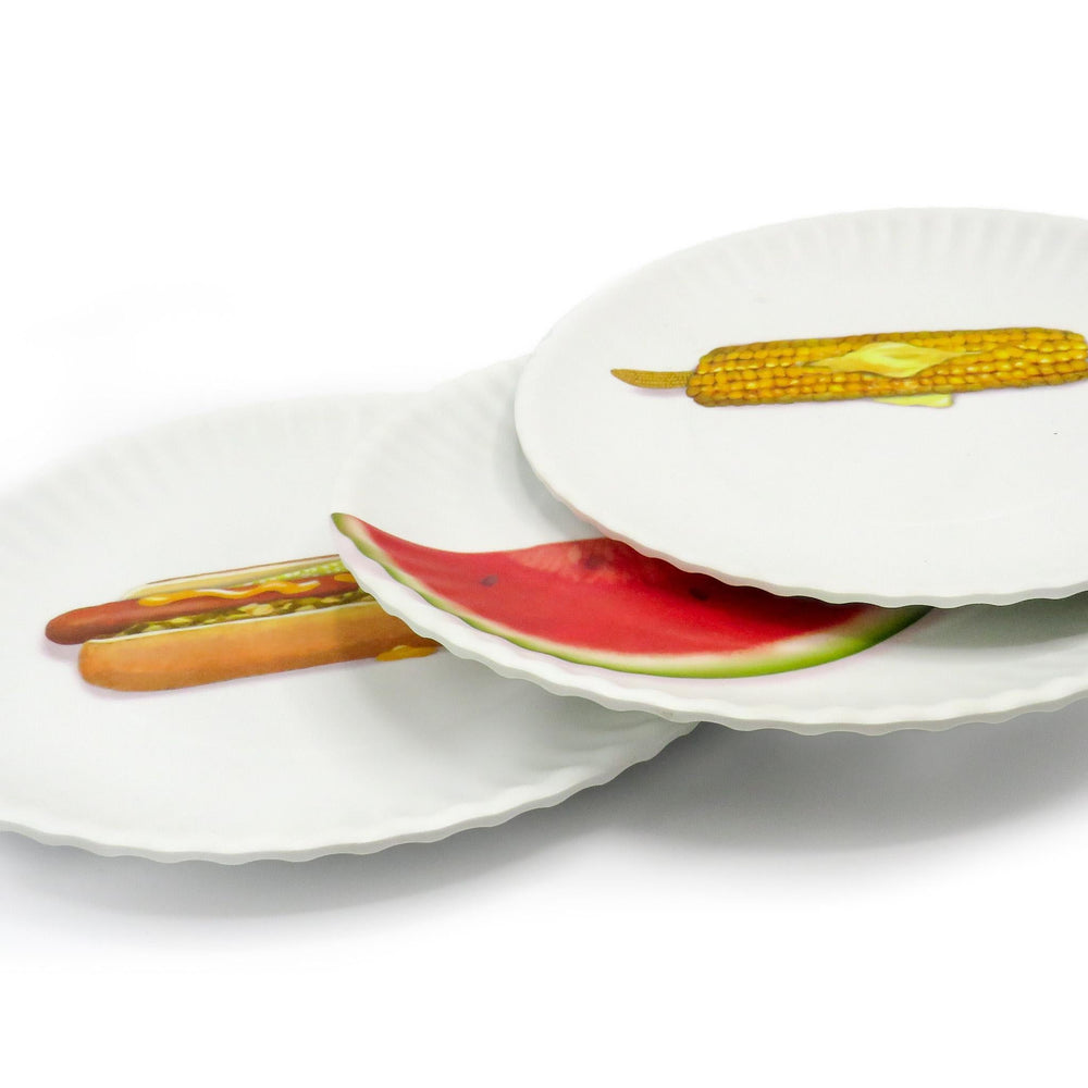 Make a statement at your garden party or picnic Melamine Plates (that look like paper plates) This set of 4 plates is printed with fun food designs that add a playful element to your outdoor gatherings. Measuring 9 inches in diameter, they are the perfect size for serving your favorite foods. Made from durable melamine material, they have a sturdy weight and smooth matte finish that mimics the look of paper plates. Plus, they are dishwasher safe, making cleanup a breeze.