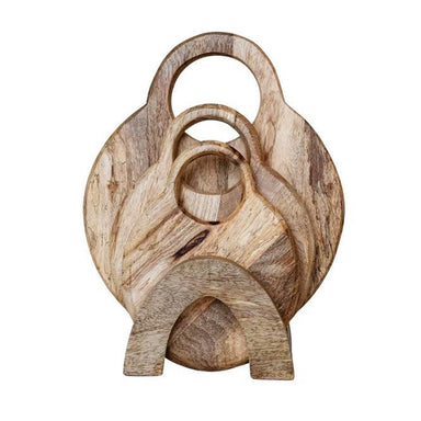 Elevate your kitchen with this set of 3 mango wood cheese/cutting boards with handles and a stand. Stylish and versatile, perfect for modern or boh...