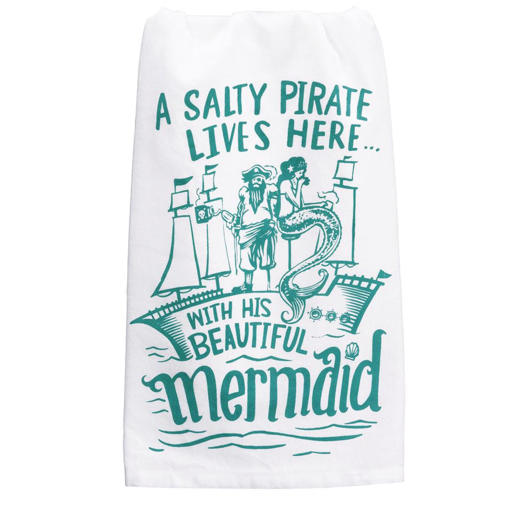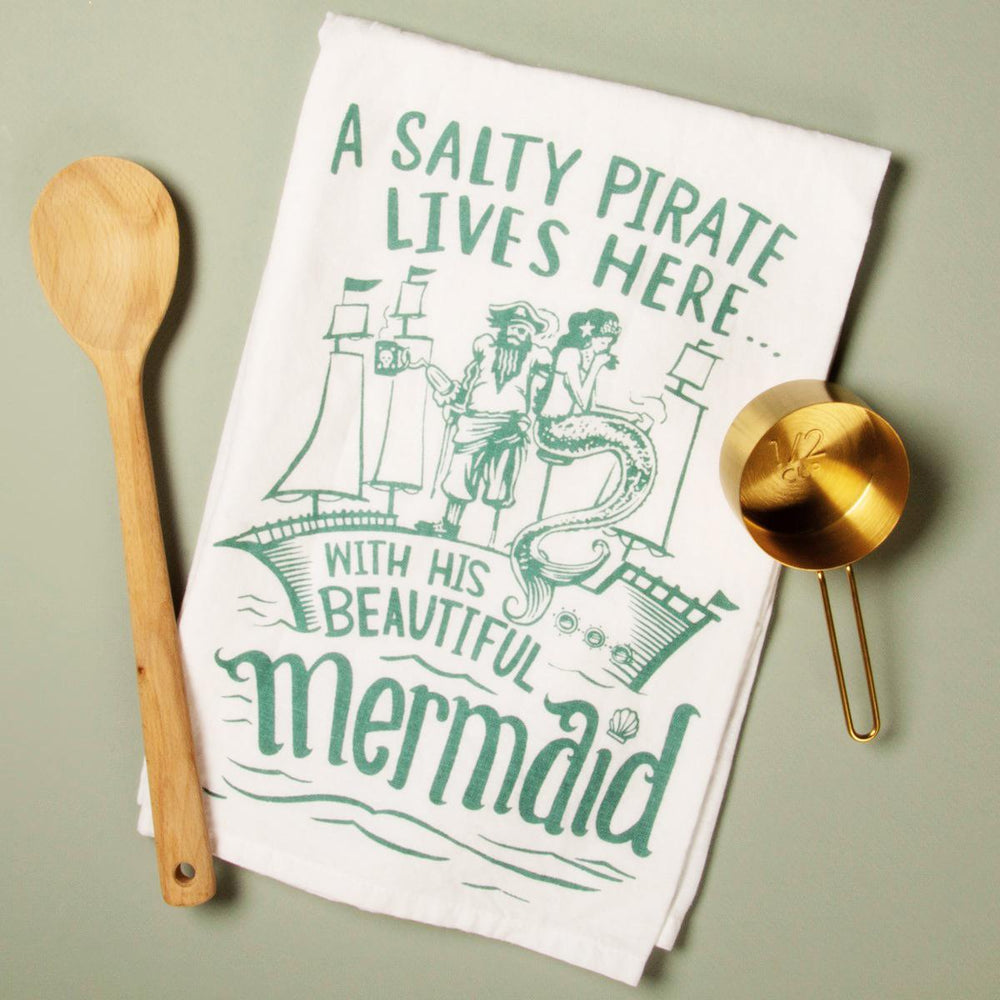Transform your kitchen with charm! Introducing our 'A Salty Pirate Lives Here With His Beautiful Mermaid' Dish Towel. This 28 x 28-inch coastal delight is made of cotton, featuring a playful printed design. Machine washable and line dry for easy care. Add a touch of whimsy to your space and let the salty pirate and beautiful mermaid make your kitchen a sea-worthy haven!