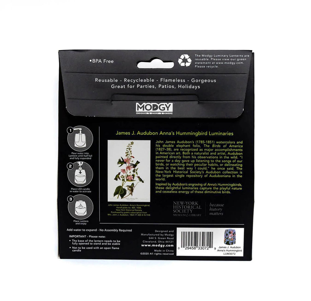 Illuminate any space with Modgy’s John J. Audubon Hummingbird Luminaries! This set of 4 BPA-free lanterns expands with water and includes water-activated LED candles with batteries. Featuring vibrant purple, green, red, and pink hues, they add elegance to any occasion. Dimensions: 6" x 6.5".